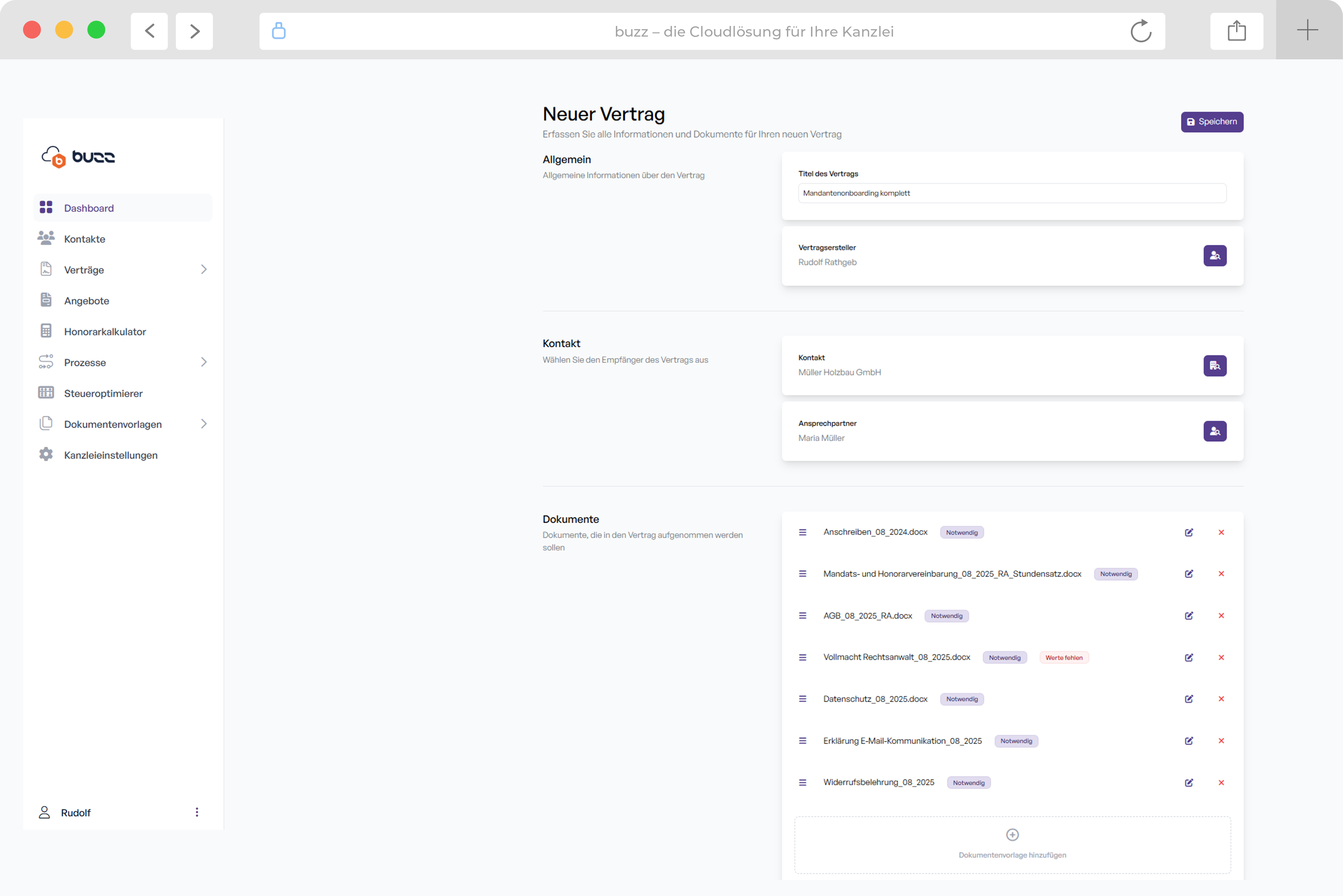 Die Lösung: buzz.ClientFlow (legal) generiert automatisch alle wichtigen Dokumente und stellt sie dem Mandanten digital zur Verfügung. Keine vergessenen Dokumente, keine manuellen Fehler, maximale Rechtssicherheit, Absicherung des Honoraranspruchs.